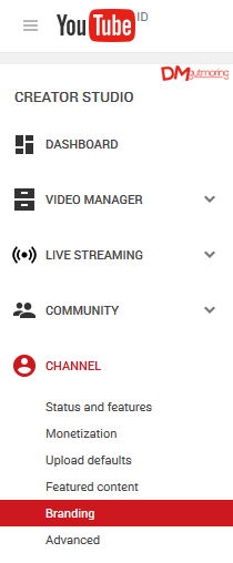 2. Setelah dihalaman Creator Studio, pada menu samping kiri pilih "Channel", lalu nanti muncul beberapa submenu dari menu "Channel", pilih Branding.